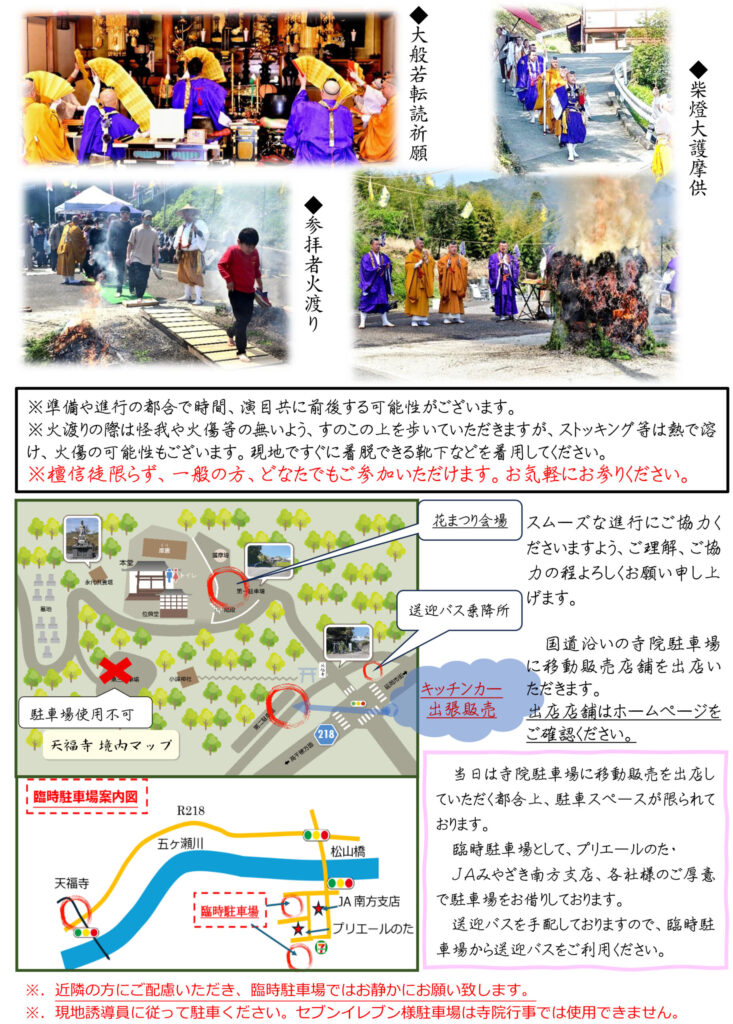 臨時駐車場より無料送迎バスを手配しておりますので、お参りの皆様は送迎バスをご利用ください。