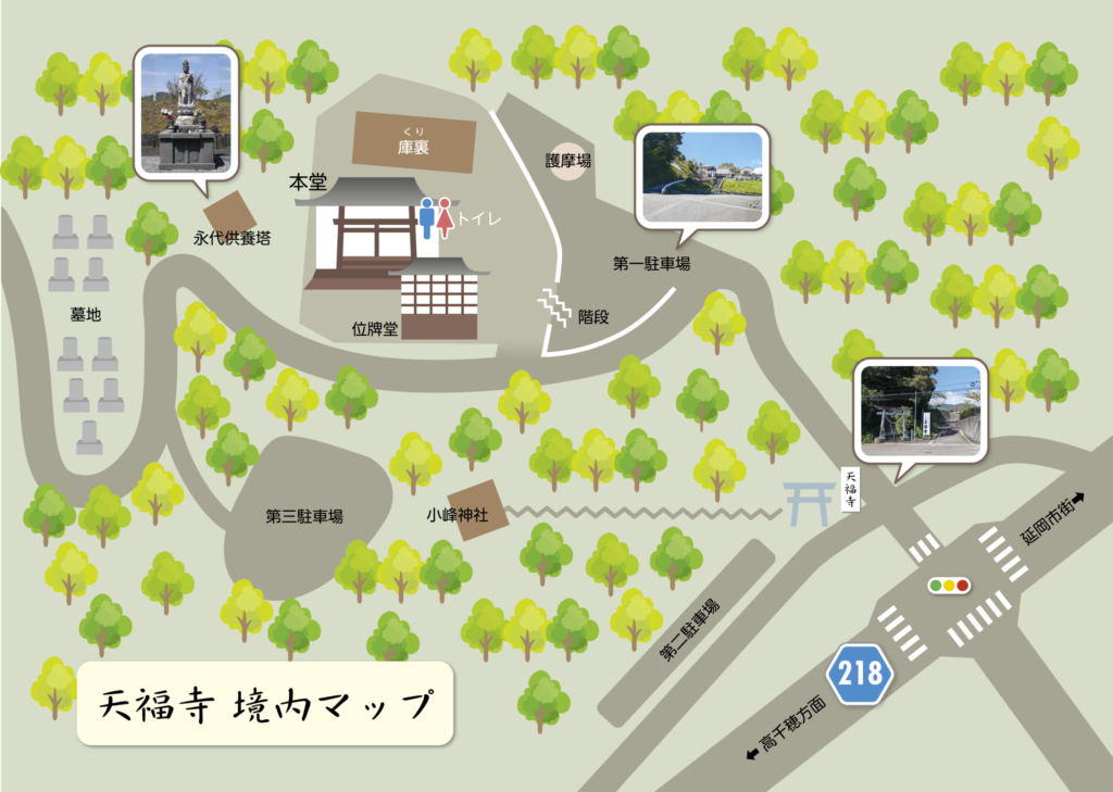 寺院所在地 寶圓山 天福寺 住所 〒882-0061 宮崎県延岡市小峰町6981 連絡先 TEL:0982-39-0537 FAX:0982-27-6274 交通アクセス 延岡ICより車で1分 宮交バス停「小峰」より徒歩5分 延岡ICバス乗降所より徒歩5分 JR延岡駅よりタクシーで15分